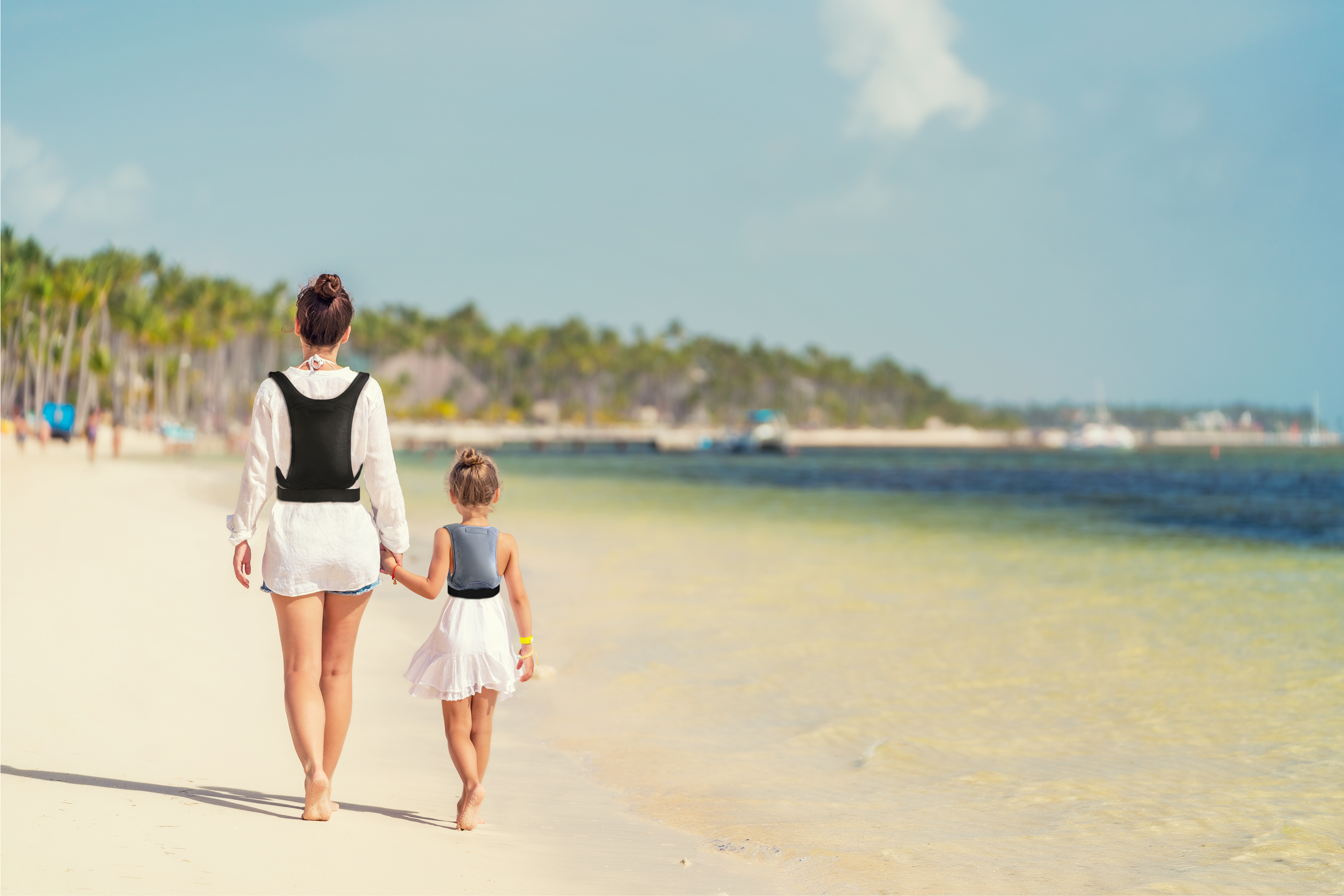 • Women and child walking on a beach whilst both wearing cooling back supports